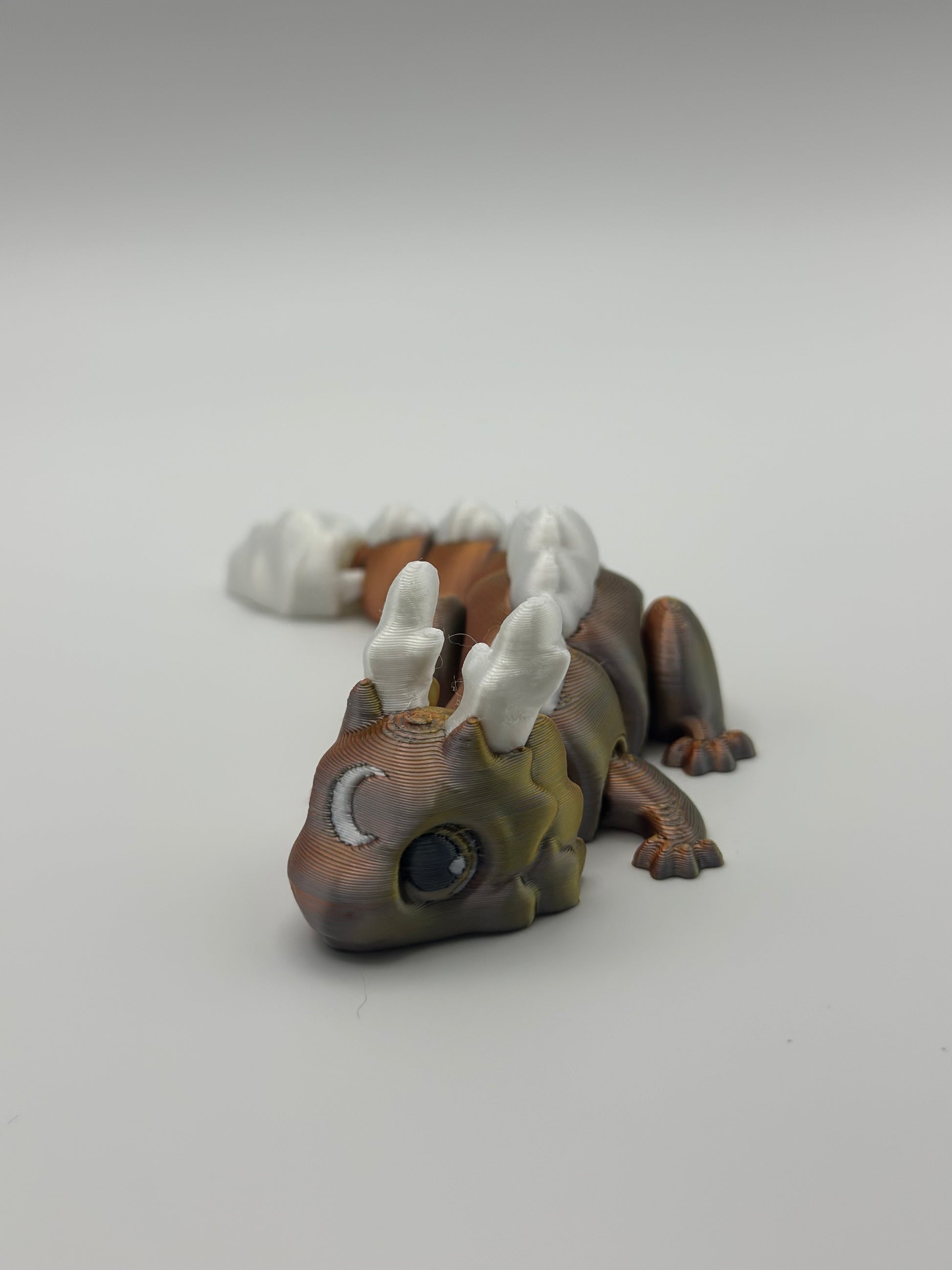 Unleash your imagination with the Cloud Dragon and its unique 3d printed design. The articulating dragon showcases a moon-shape on its face and a cloud pattern on its back.