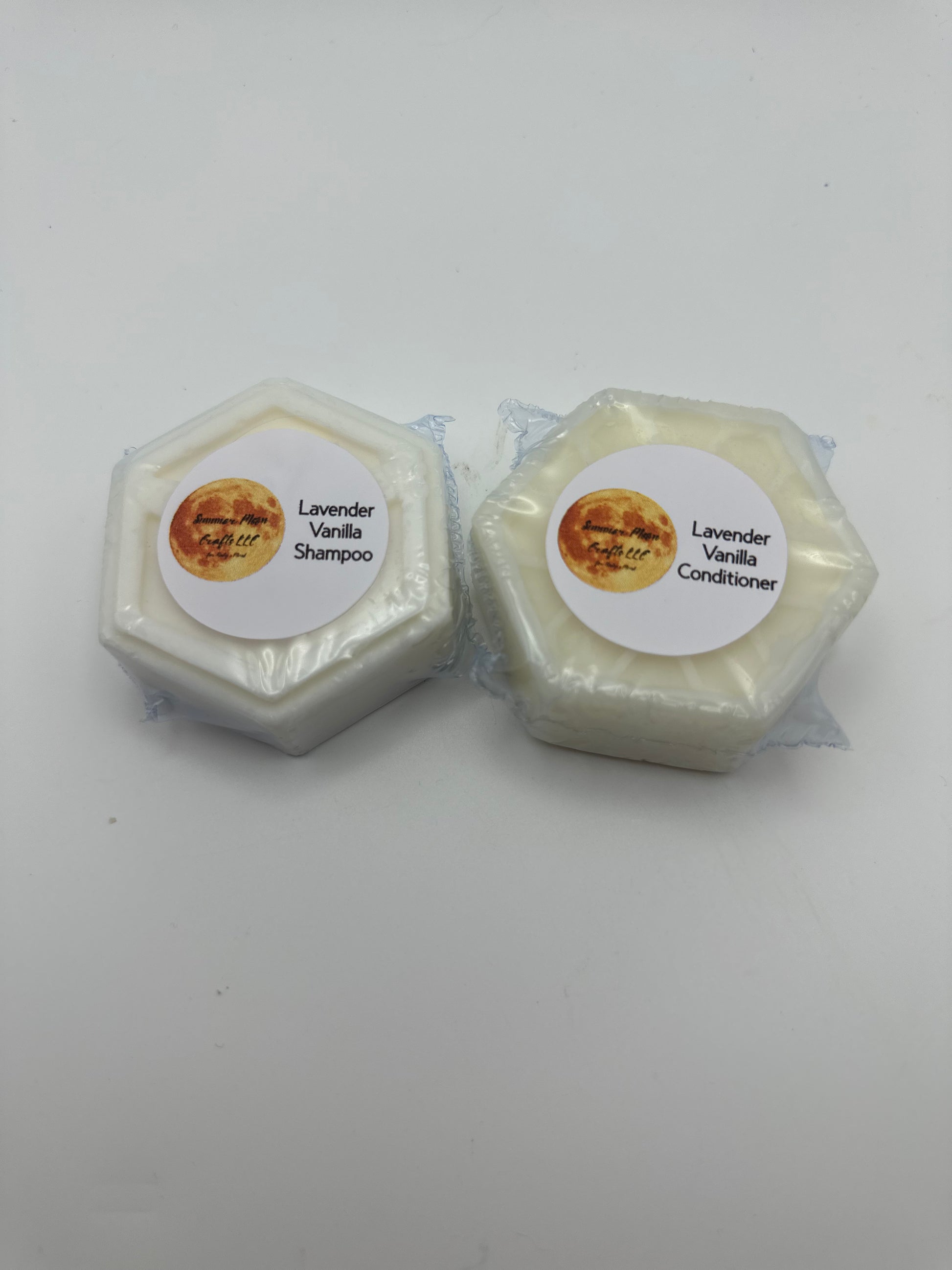 Set comes with a bar of shampoo, a bar of conditioner, and a soap bag.