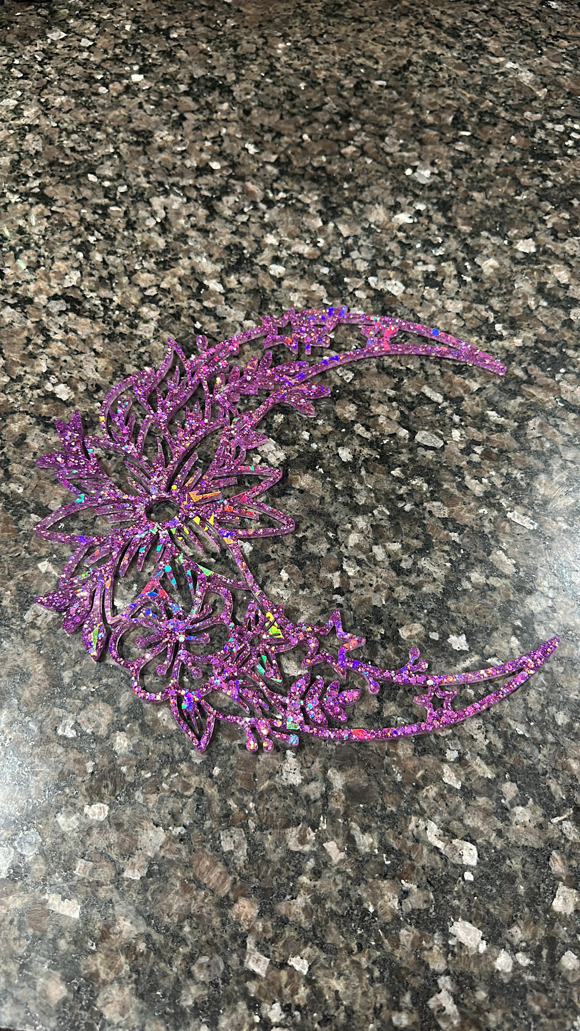 Introducing our holographic Crescent Moon Wall Art. Made of durable resin with a stunning flower pattern, this crescent-shaped piece will add a touch of magic and whimsy to any room. Hang it up and let the good vibes flow!