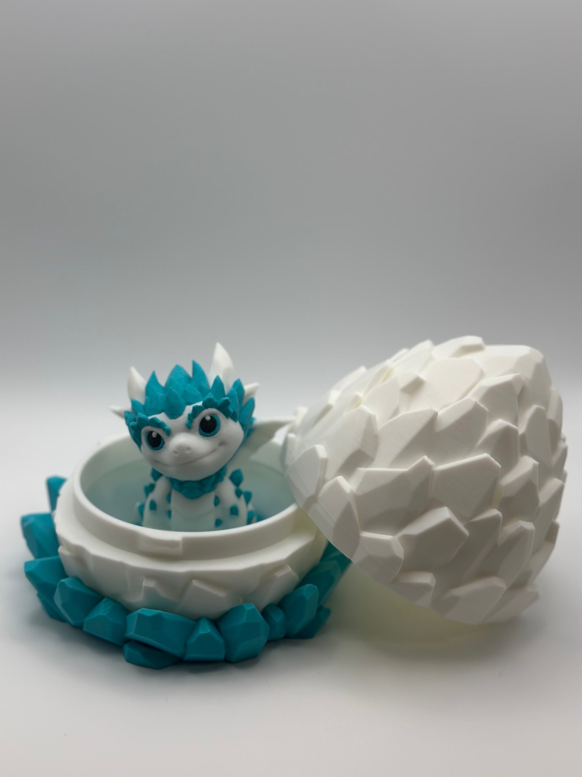 Let this 3D printed Crystallis Dragon with Egg hatch some joy in your life! Featuring a unique and intricate crystal design, this dragon and egg duo is a stunning addition to any space. The egg measures approximately 5.25” x 5” x 5.5” and the dragon measures approximately 3” x 3” x 4”. Perfect for dragon and crystal lovers alike!