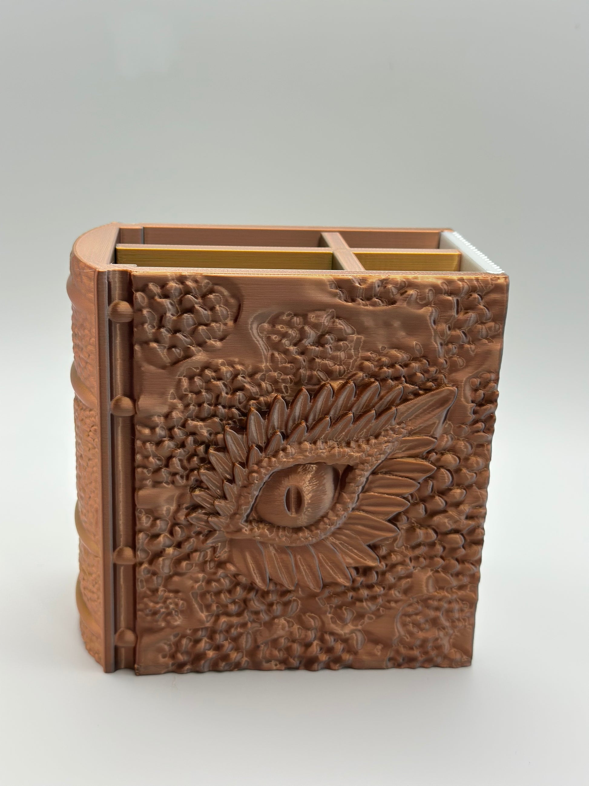 Organize your writing tools with this Dragon Book Container. The 3D printed design features intricate dragon scales and a fierce eye pattern. Its compact size, approximately 4.7" x 3.1" x 4.6", makes it perfect for any desk. No need to hoard supplies, this container will guard them with its fiery charm.