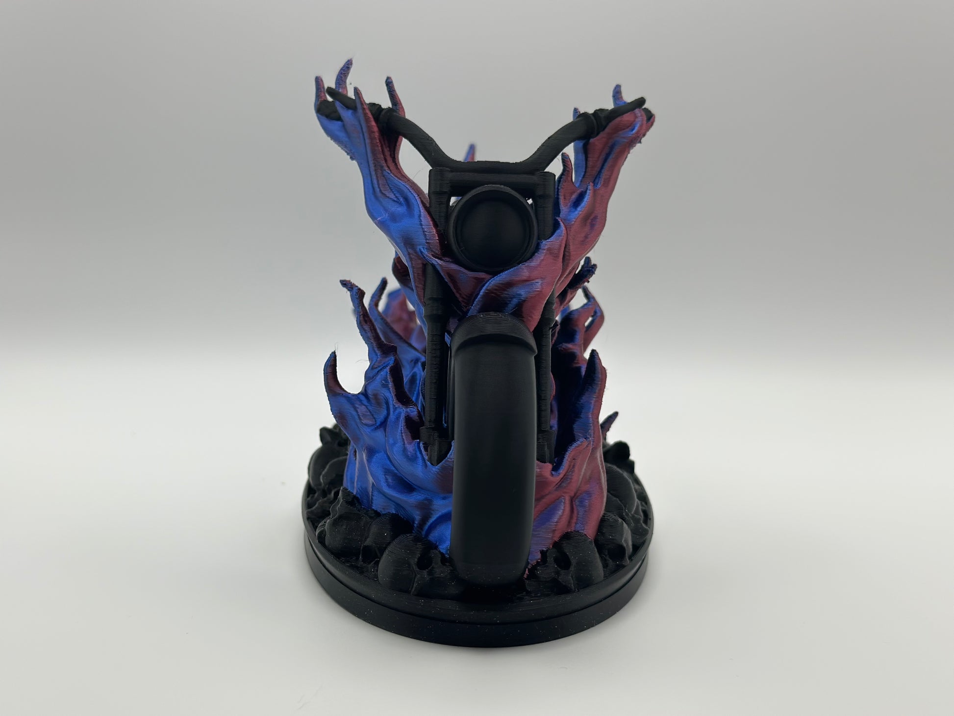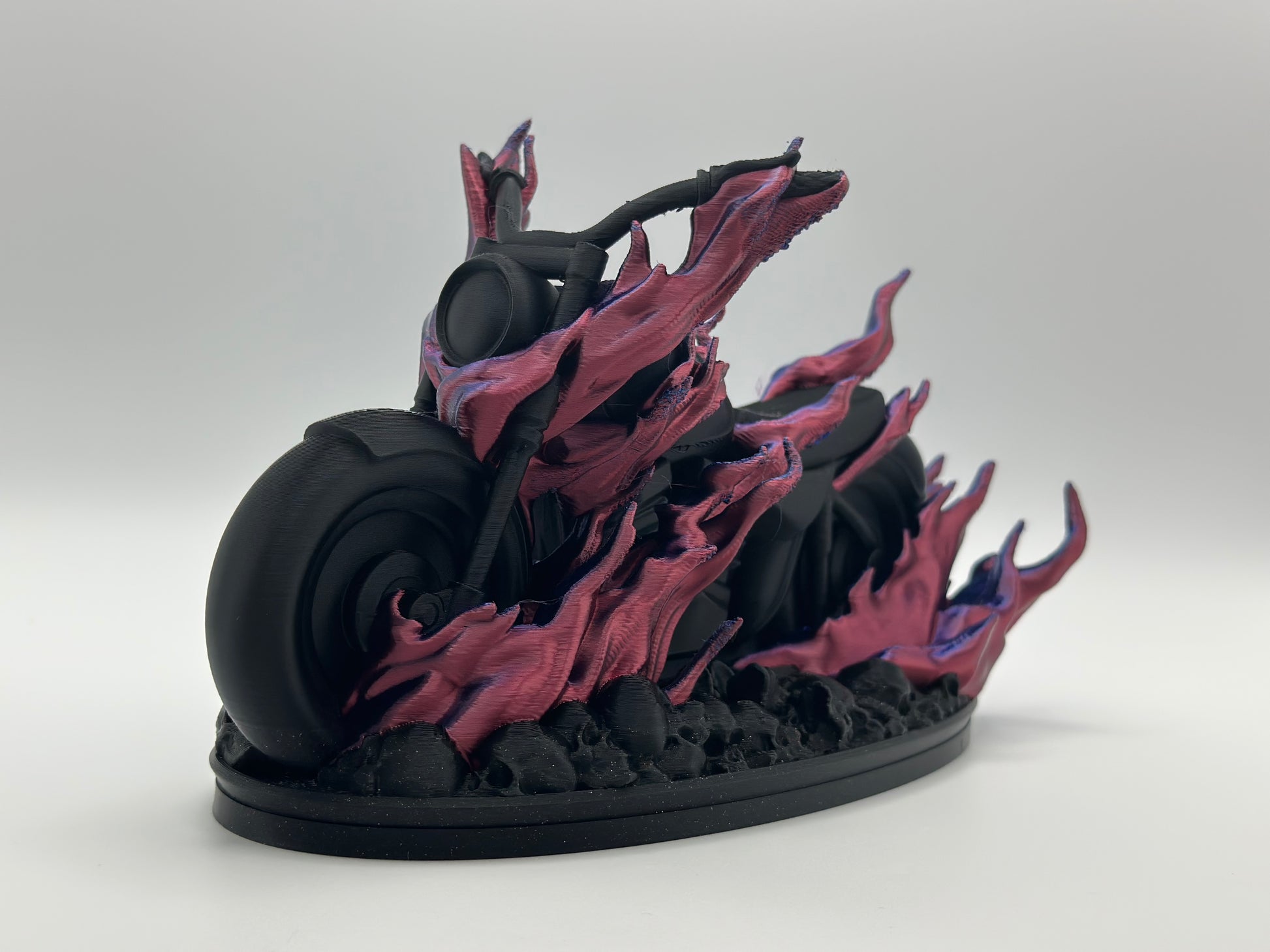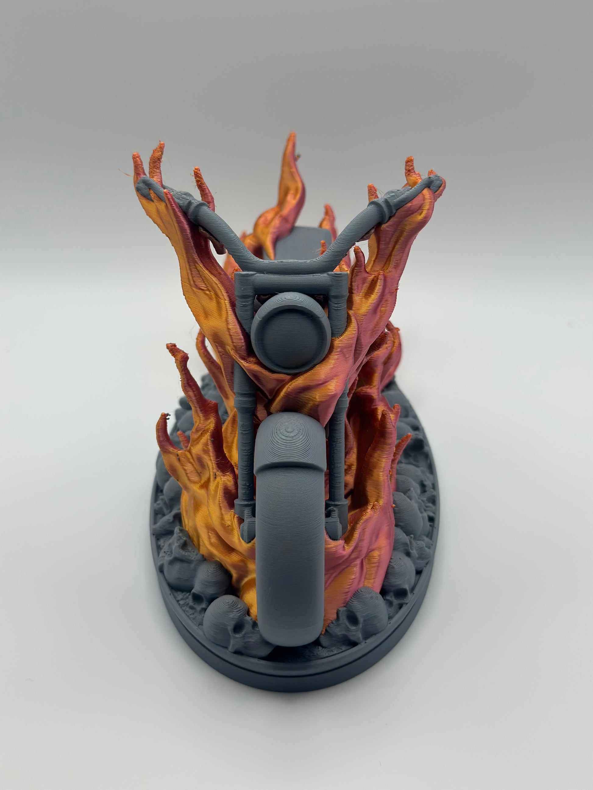 Ride fearless with this 3D printed, flaming motorcycle atop skulls. Measuring at approximately 7.5" x 3.5" x 4.5", this bold piece will add a touch of adventure to any collection. Take on the road with this daring addition!
