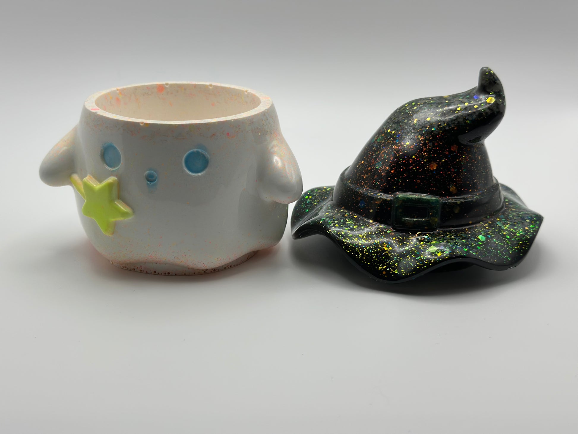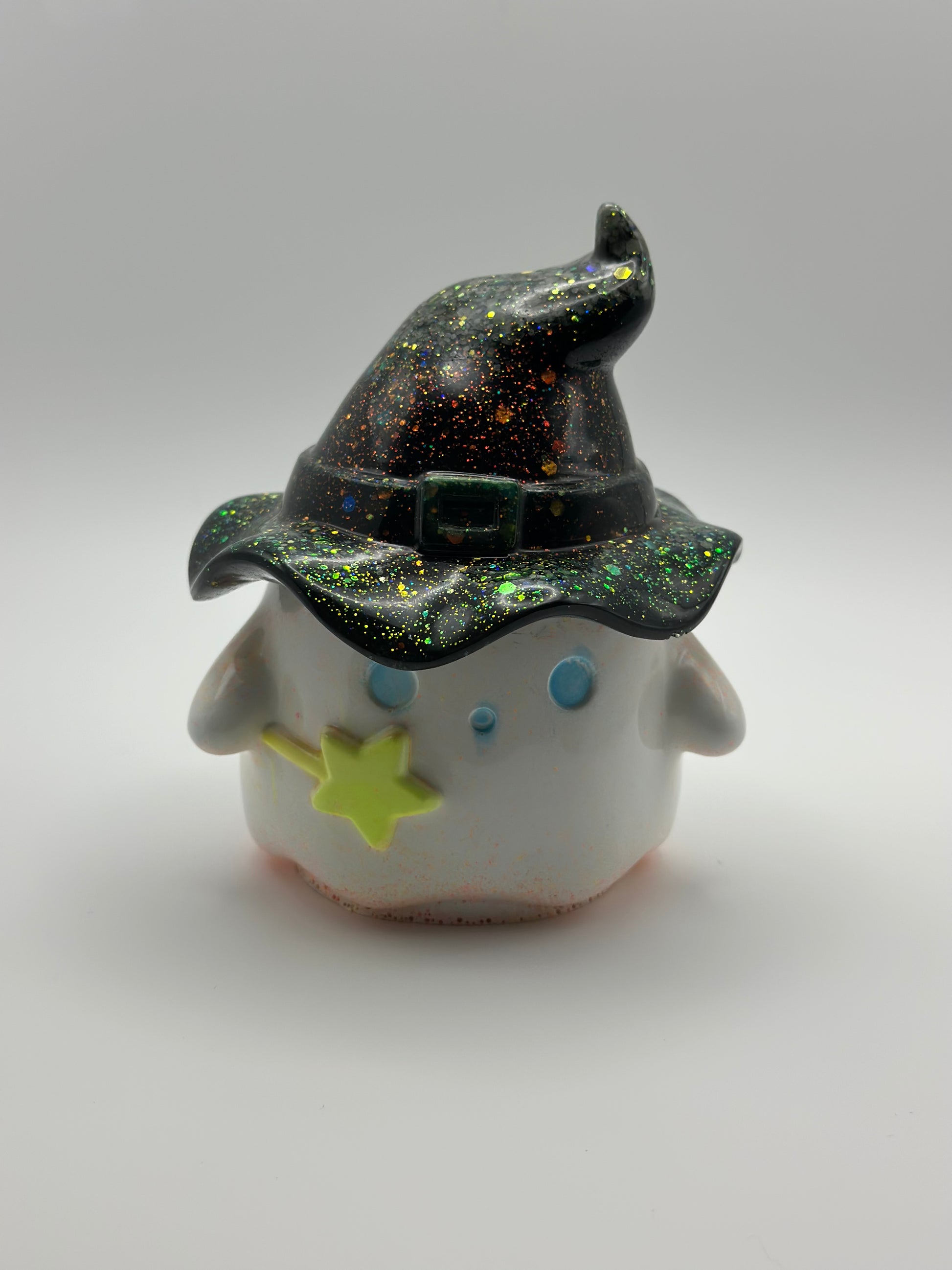"Add a touch of spooky charm to your home with the Ghost Witch Jar. Crafted from durable resin, this jar features a playful ghost wearing a witch hat, with the lid cleverly designed as the hat. Measuring approximately 4 inches in diameter and 5 inches tall, it's the perfect size for storing trinkets or candy. No spells required, just a fun and unique addition to your décor!"