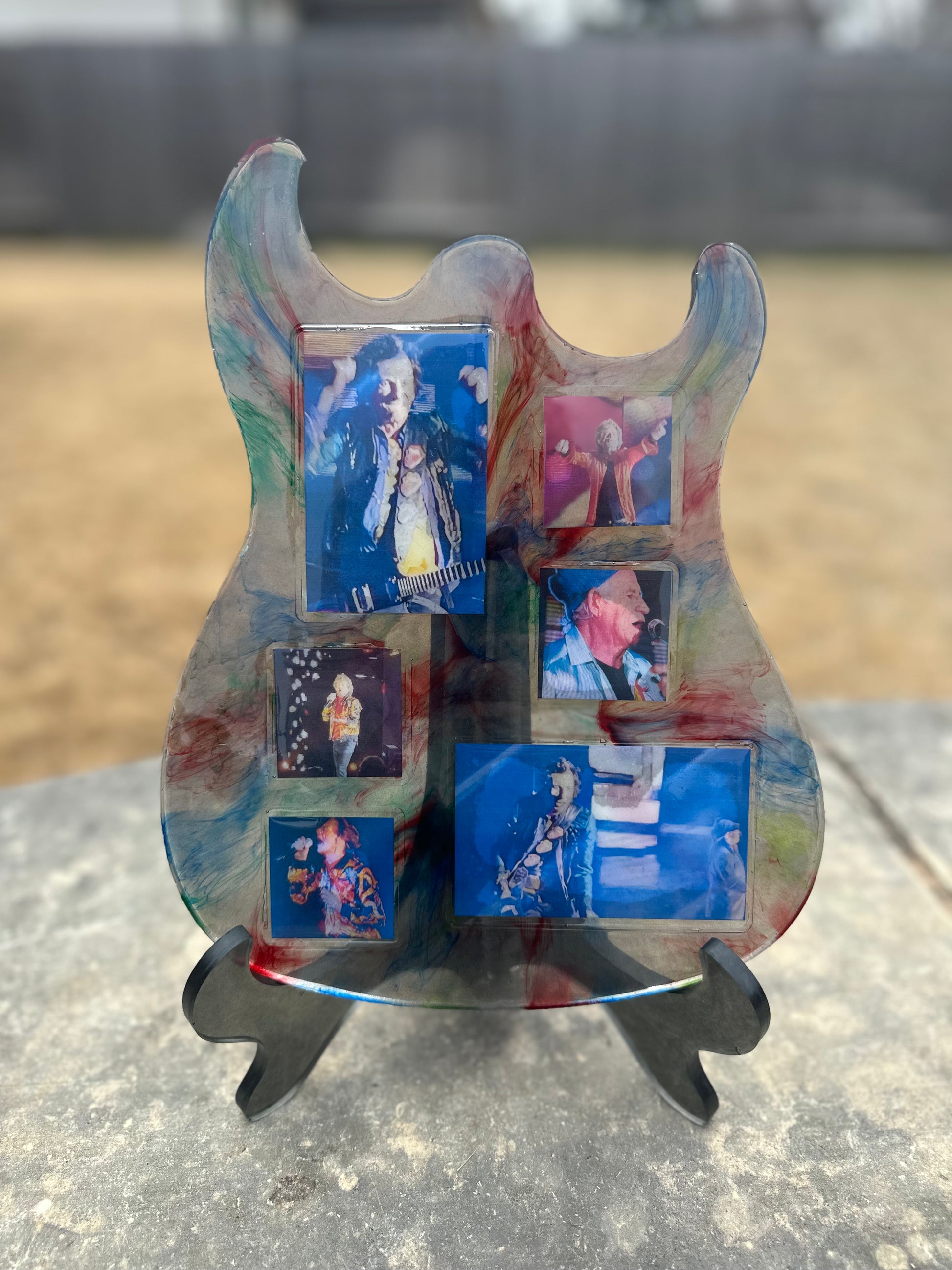 "Elevate your music experience with our premium resin guitar, featuring a sleek and unique guitar bottom shape. This standout piece also comes with a complimentary stand for elegant and convenient display. A must-have for any true music connoisseur."