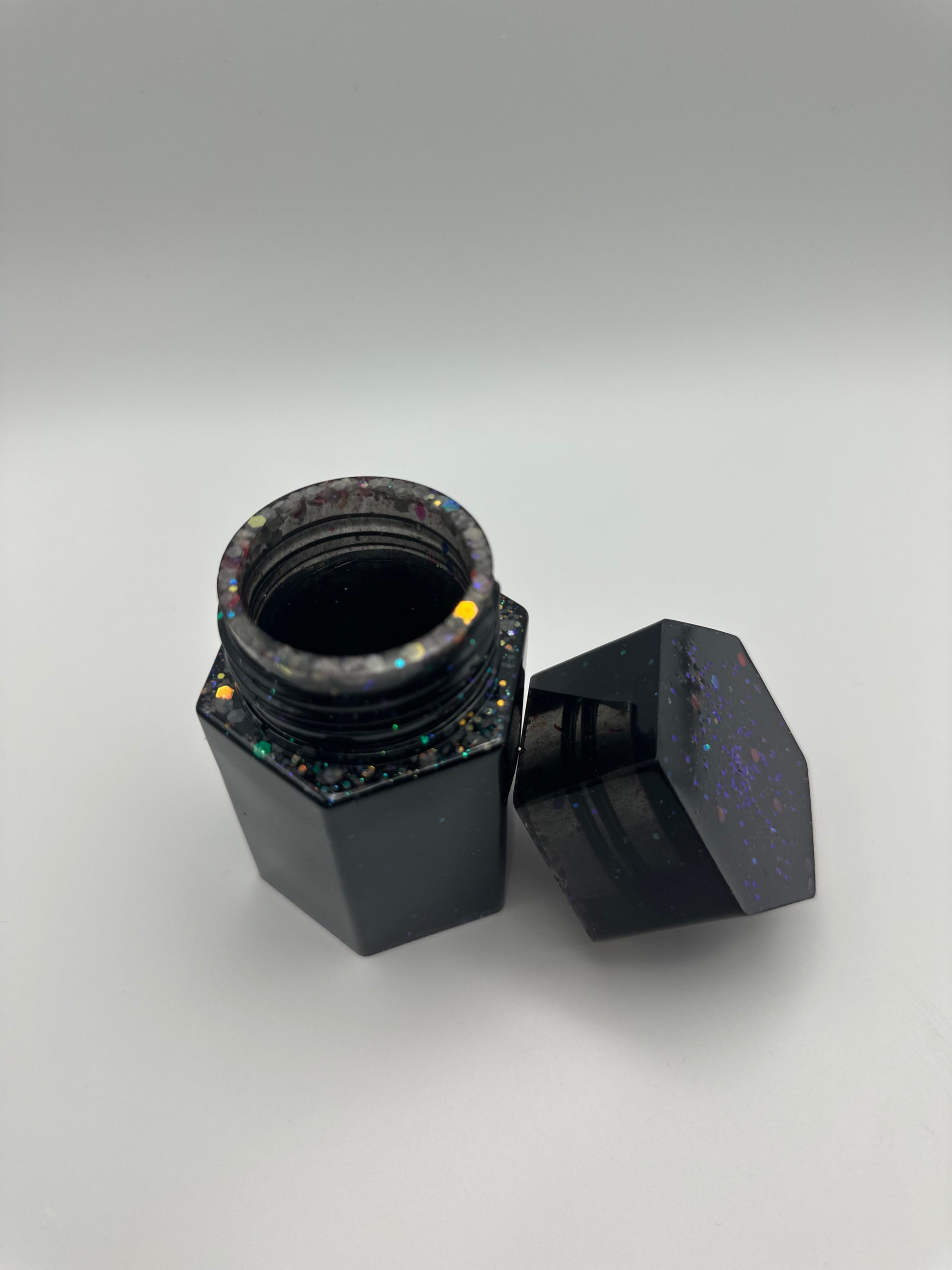 This Hexagon Jar is a perfect addition to your home decor collection. Made of high-quality resin, its unique hexagon shape adds a touch of modern elegance to any room. The included lid keeps contents secure and fresh. Display trinkets, candy, or use for storage.
