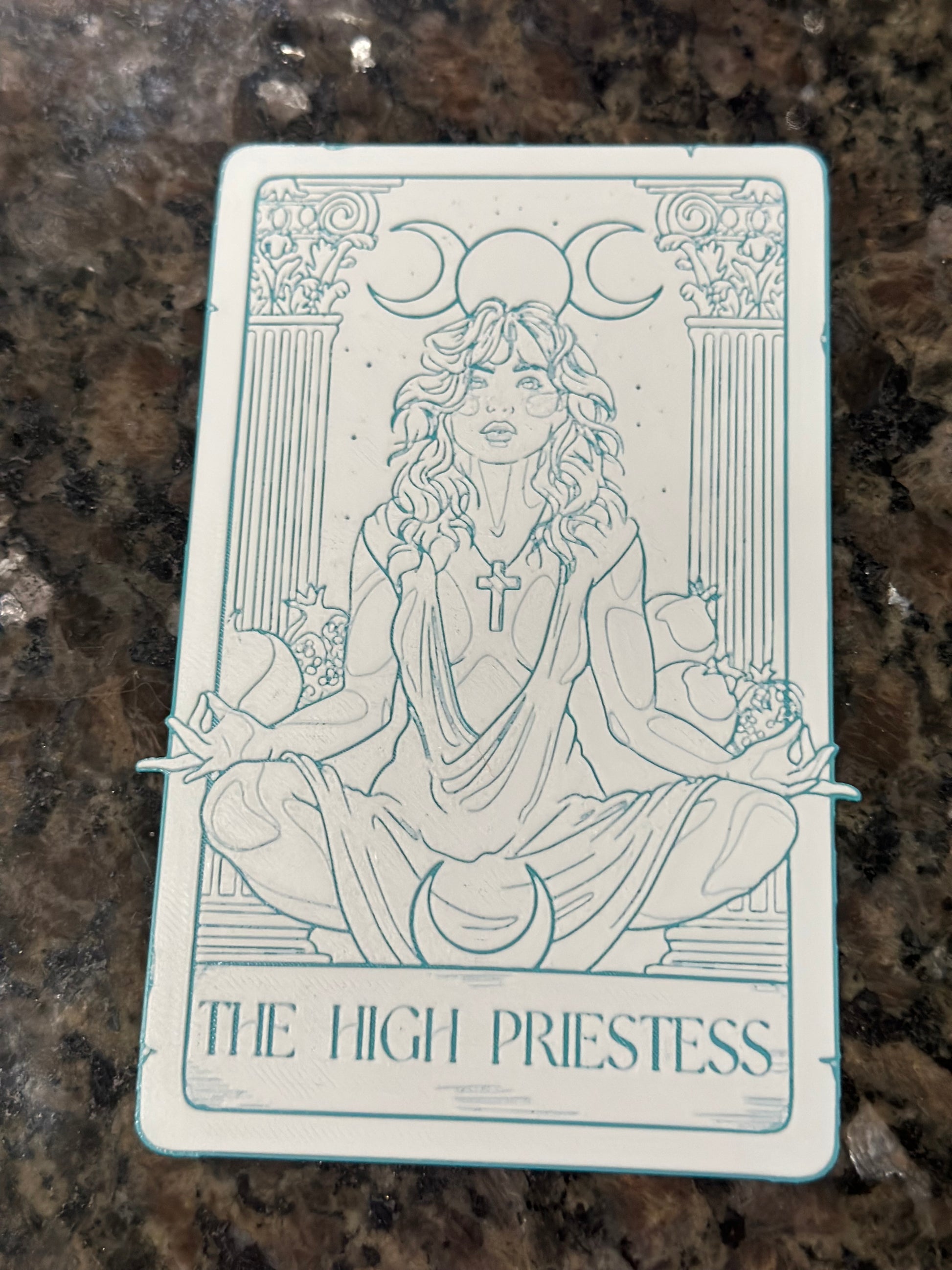 Unleash the mysteries of the tarot with the High Priestess Card! This 3d printed major arcana card measures approximately 4" x 6" x 0.01" and will guide you on a journey of self-discovery and intuition. Dare to explore the unknown with this powerful tool in your hand!