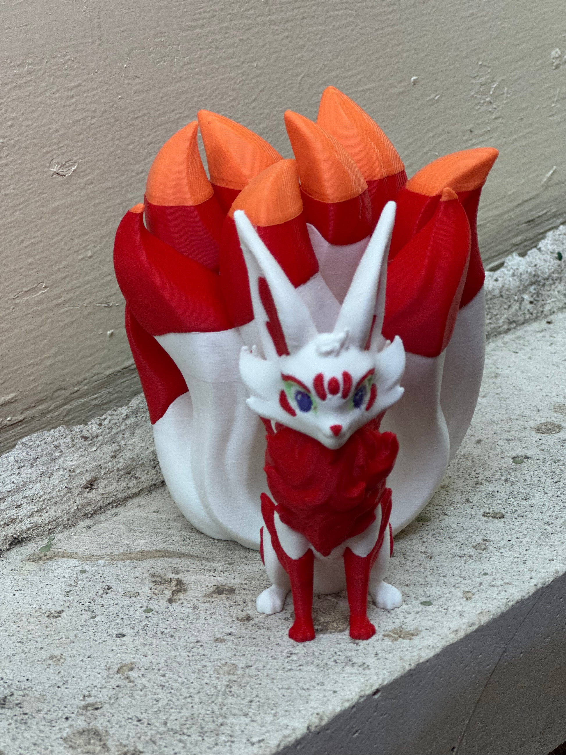 "Unleash Kitsura, the playful and poseable spirit fox, crafted with 3D printing technology and an articulating head. This whimsical companion adds a touch of magic to your desk or shelf. (Warning: playing with this fox may result in a sense of wonder and delight.)"