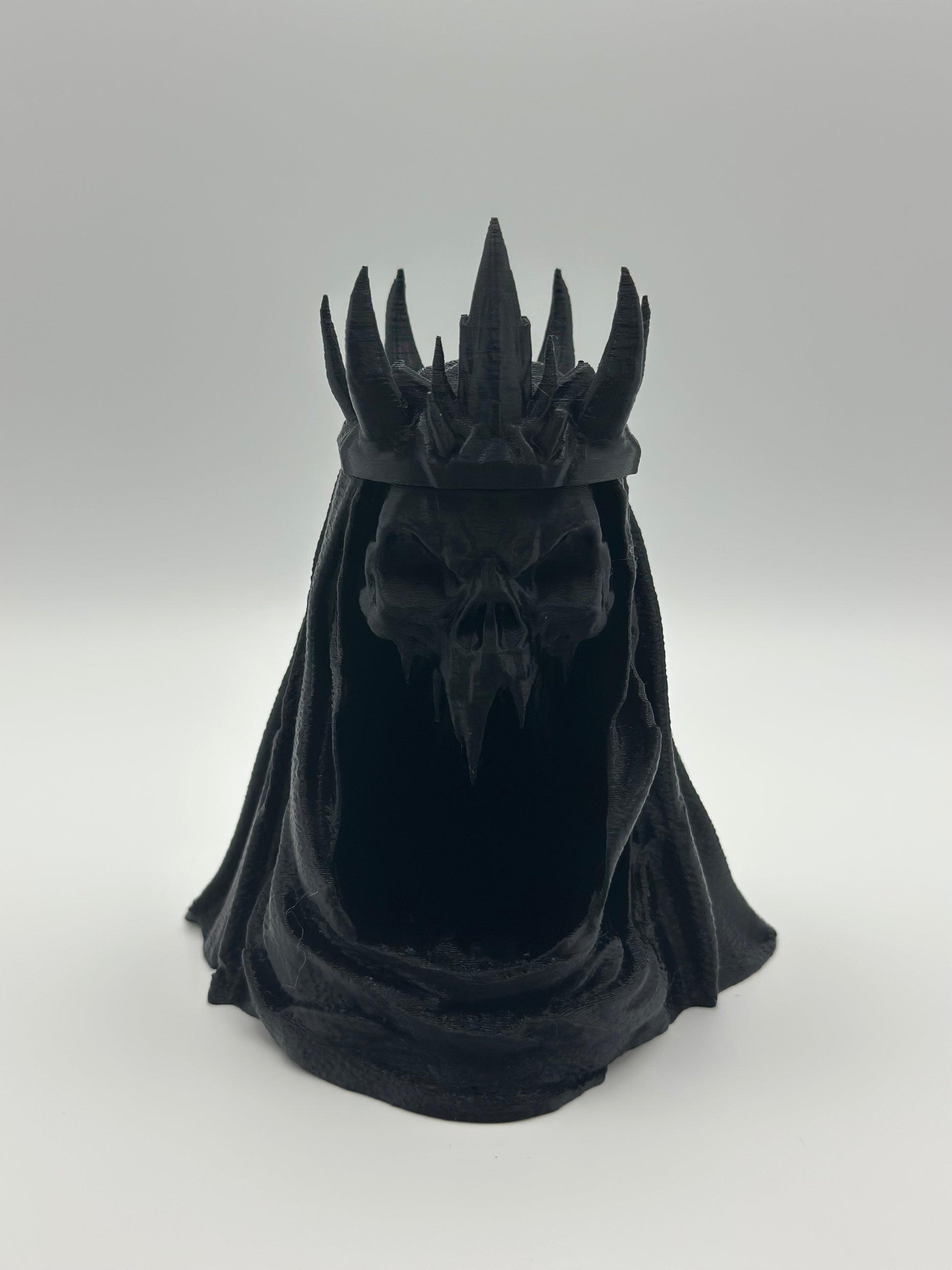 "Unleash your inner daring spirit with the Night King Ring/Bracelet Holder. Boldly designed with a 3d printed, LOTR wraith head, this accessory stands at a compact size of 3.75” x 4.5” x 4.5”, making it a perfect addition to your adventurous lifestyle."