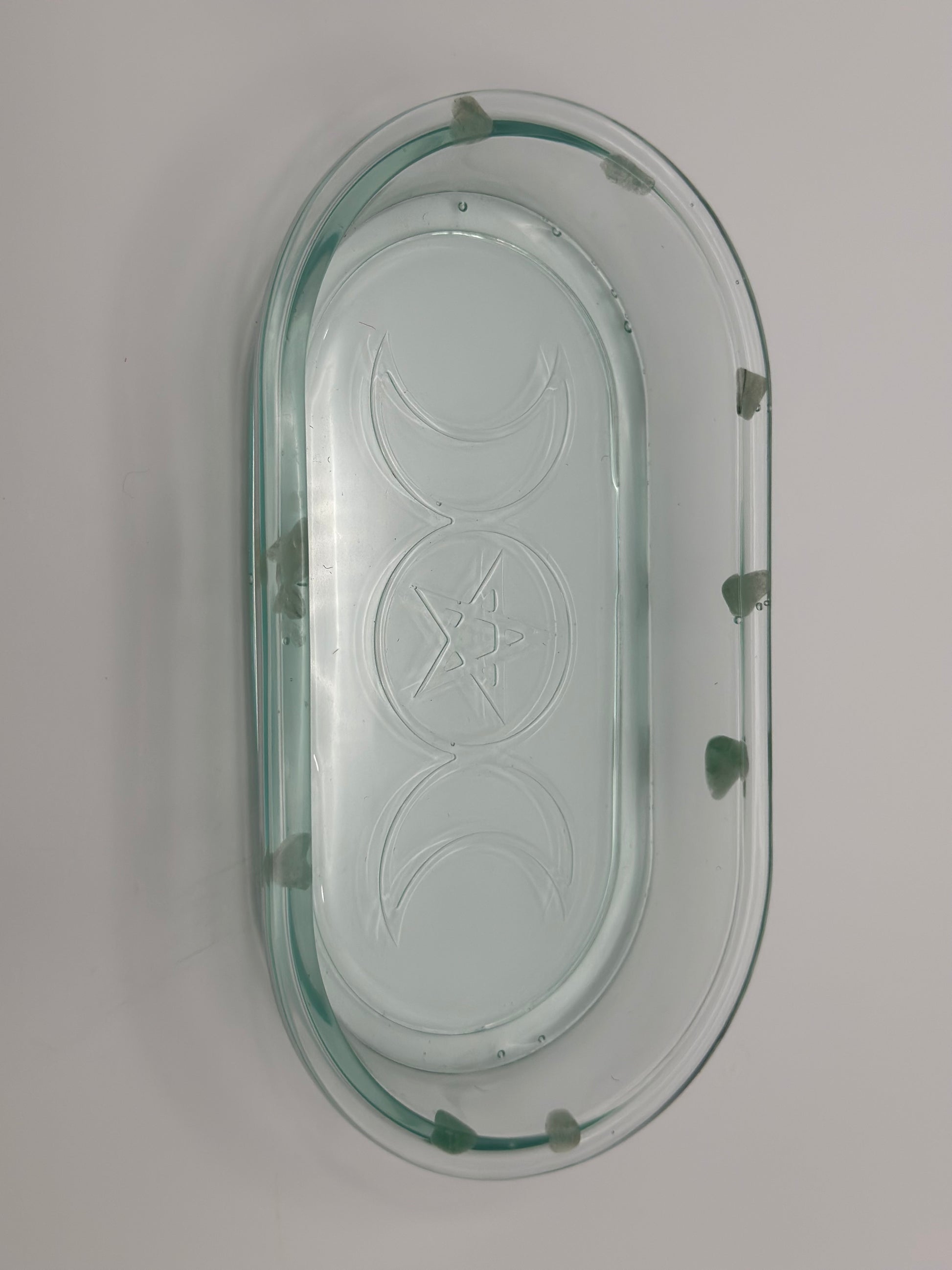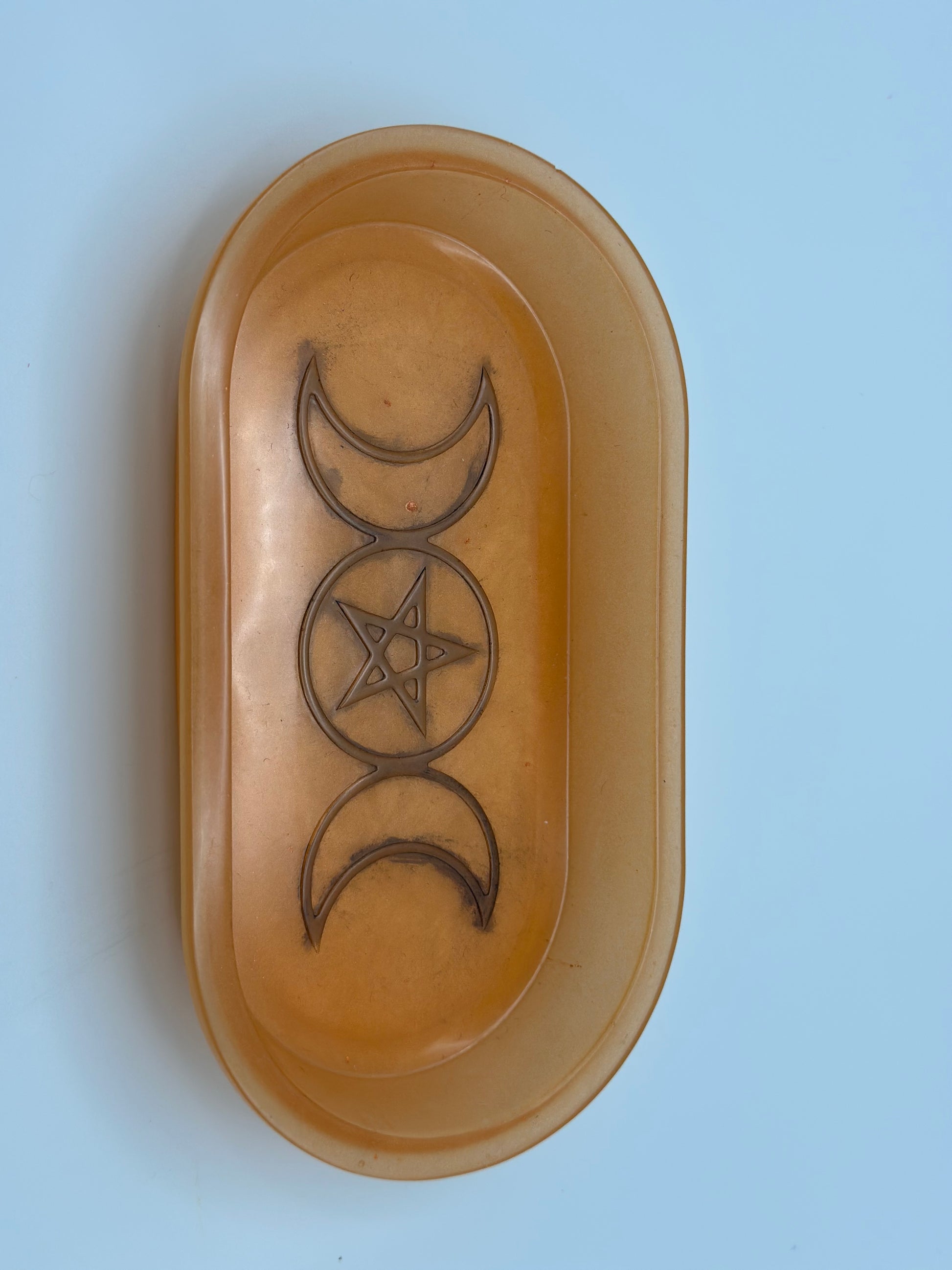 Elevate your decor with our stunning Pentagram Tray! Made of high-quality resin, its unique oval shape and intricate triple moon with pentagram design will make a bold statement in any room. Perfect for displaying small items, but not safe for food. Add a touch of magic to your home today!