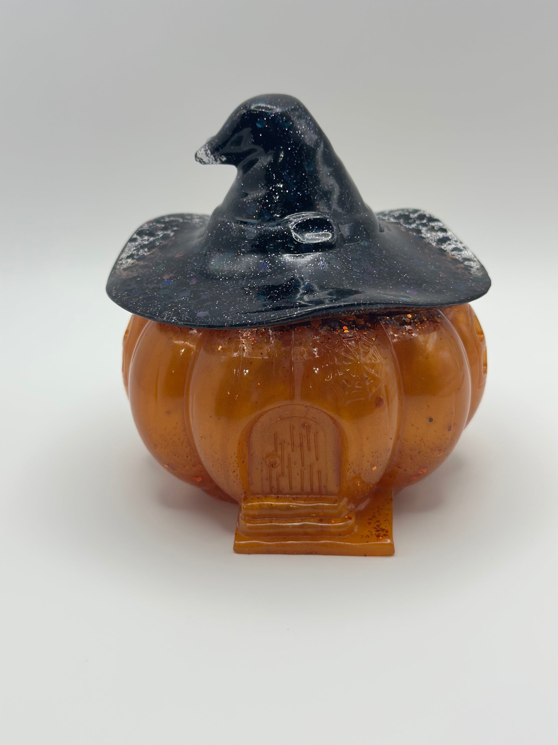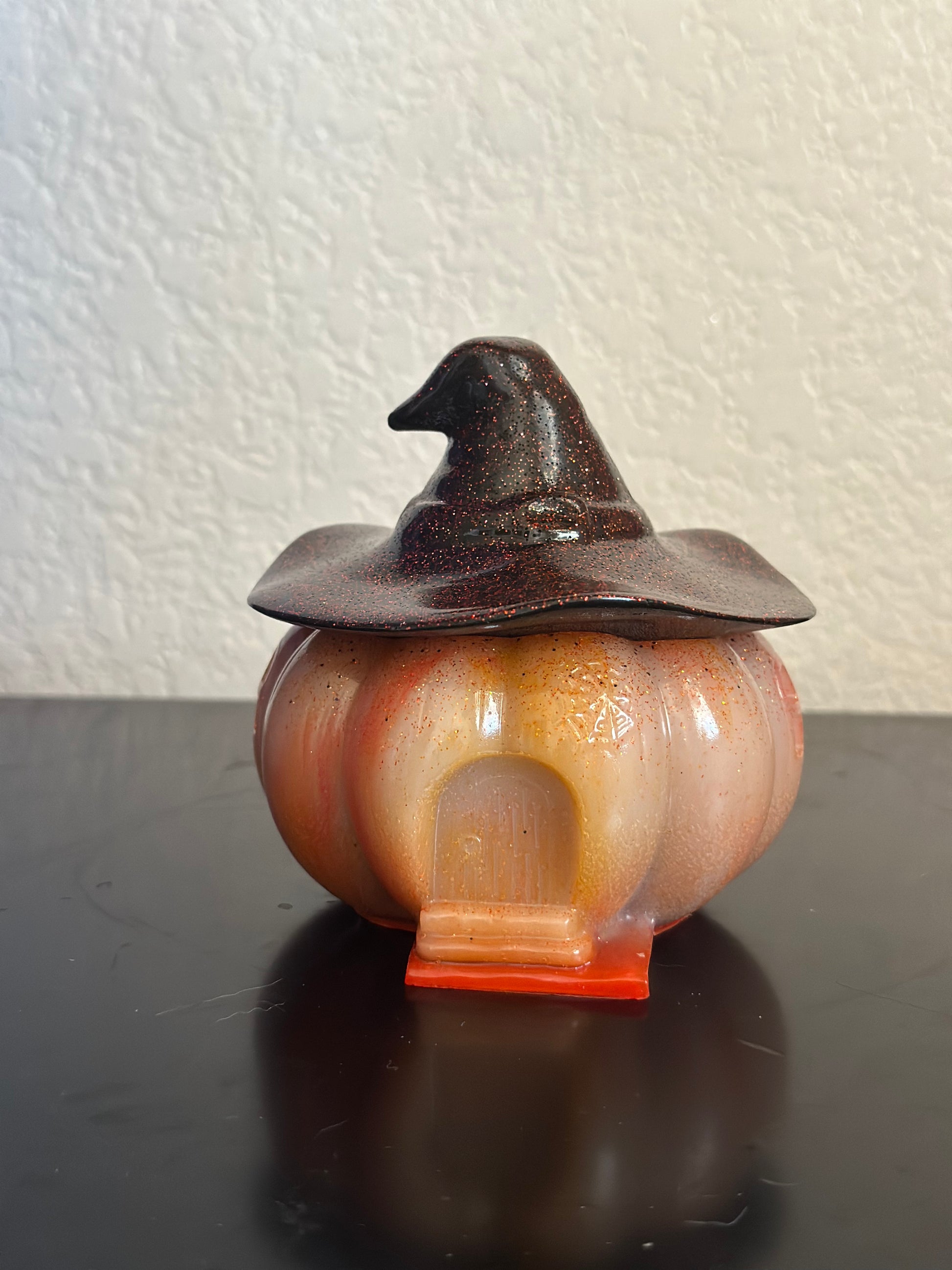 This spooky Pumpkin Witch Jar is perfect for storing your magical trinkets. Made of sturdy resin with a pumpkin house design and a witch hat lid, it measures approximately 4" in diameter and 4.5" tall. Keep your spells and charms safe (and stylish!) with this unique jar.