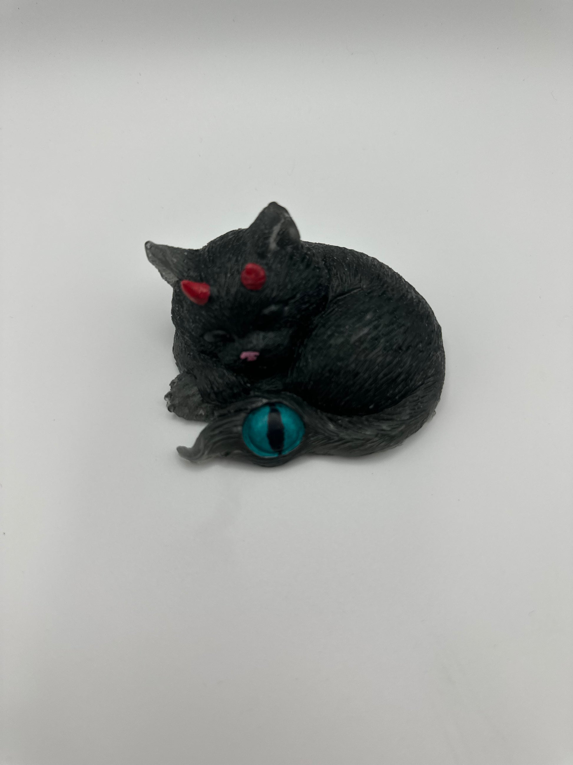 This resin cat figurine is a playful addition to any home! With its sleeping pose and devil horns and eye designed tail, it's sure to add a touch of mischief and charm. A fun and unique gift for any cat lover. (Cat-nap with a twist!)