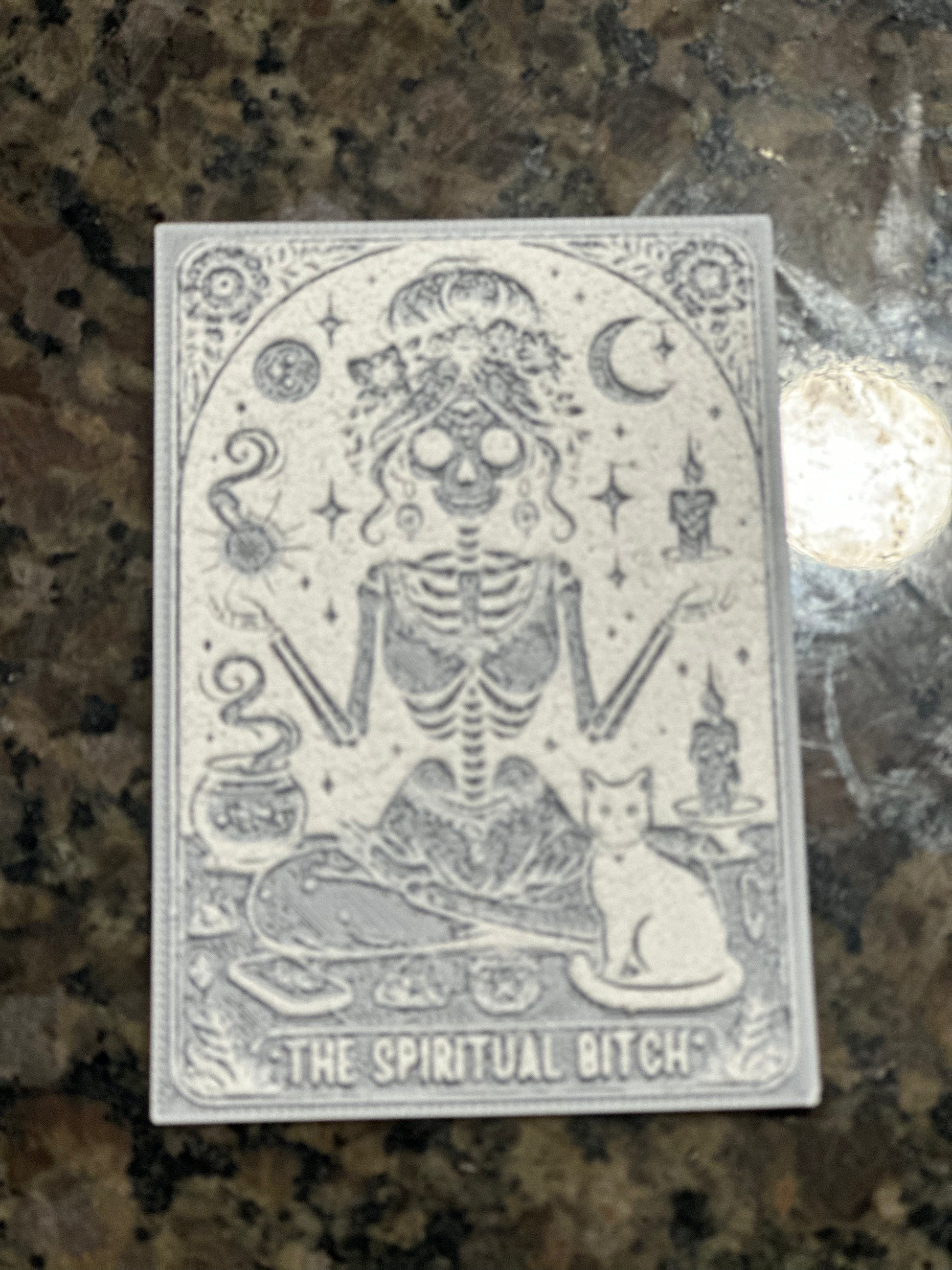 "Get ready to channel your inner Spiritual Bitch with this 3d printed faux tarot/oracle card. Unleash your sassy side and tap into the mystical realm with this unique and playful addition to your collection. No need to take yourself too seriously, just trust in the cards and let your inner bad bitch shine through. (Warning: may cause excessive sassiness and spiritual enlightenment.)"