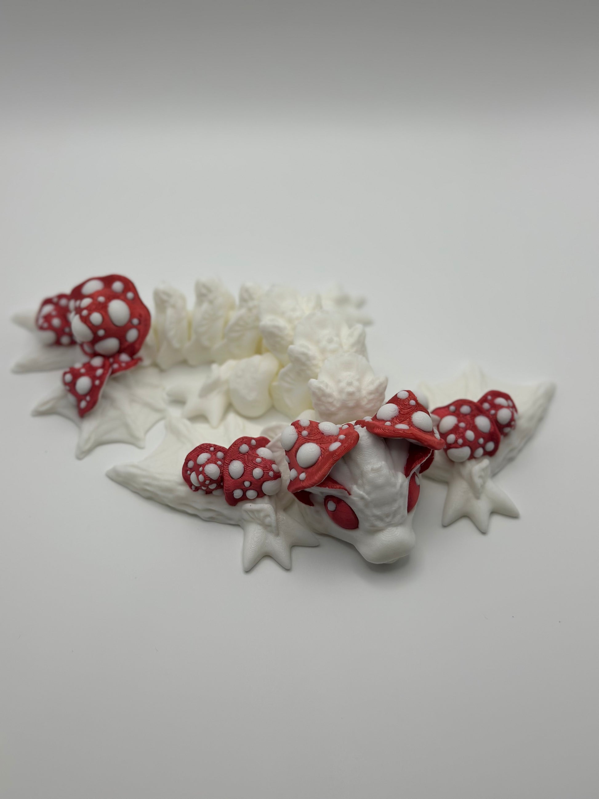"Add some whimsy to your decor with the Tiny Mushroom Wyvern. This articulated figurine, measuring 7.5" x 6.25" x 1.5", features intricate 3D printed mushroom designs. Perfect for any quirky collector (or fungi enthusiast)!"