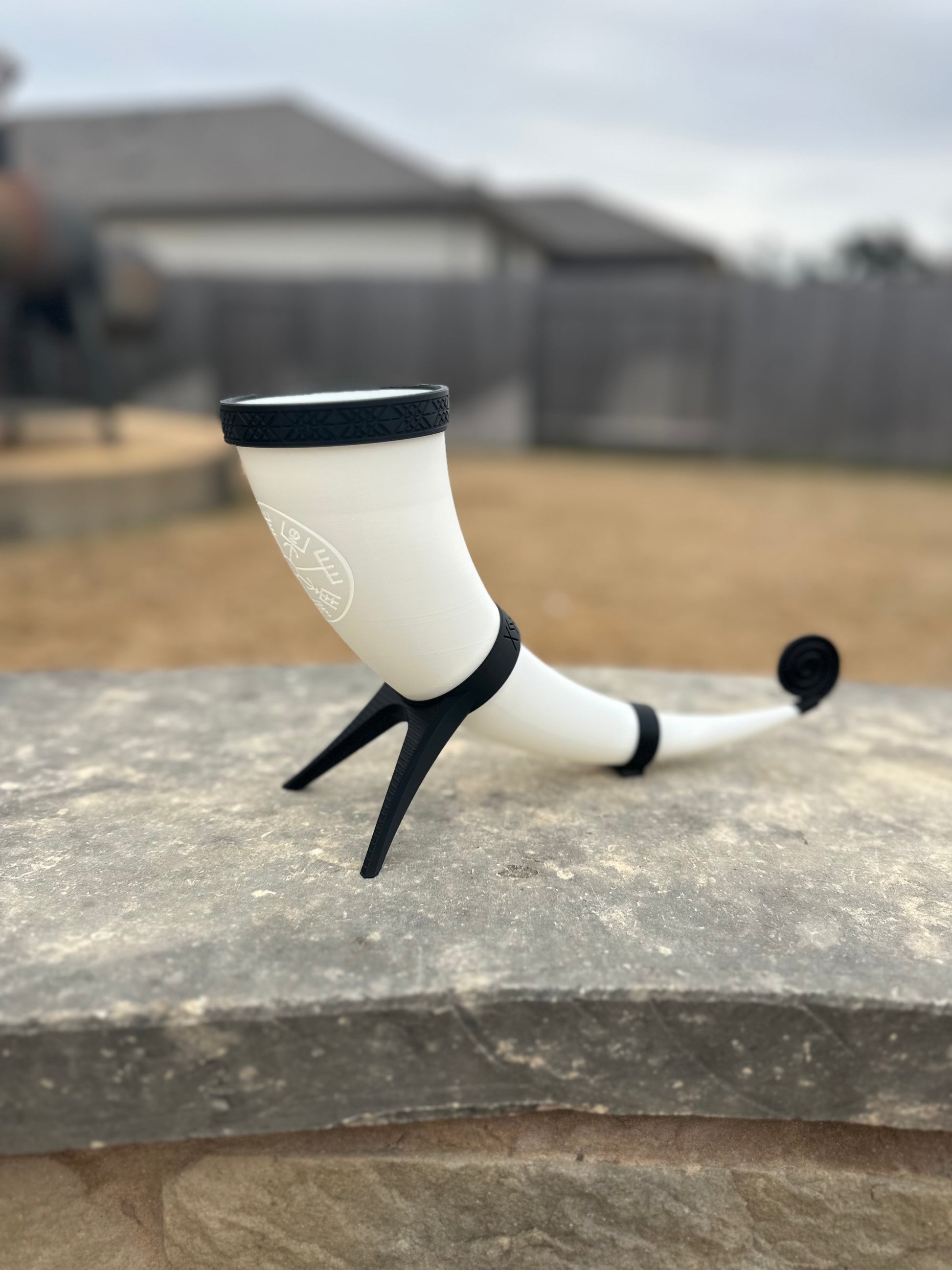 Embrace your inner Viking with our 3d printed drinking horn! Adorned with Viking designs, this horn is perfect for displaying on your mantle or using as a prop in reenactments. Please note, this product is not meant for actual drinking. Unleash your warrior spirit now!