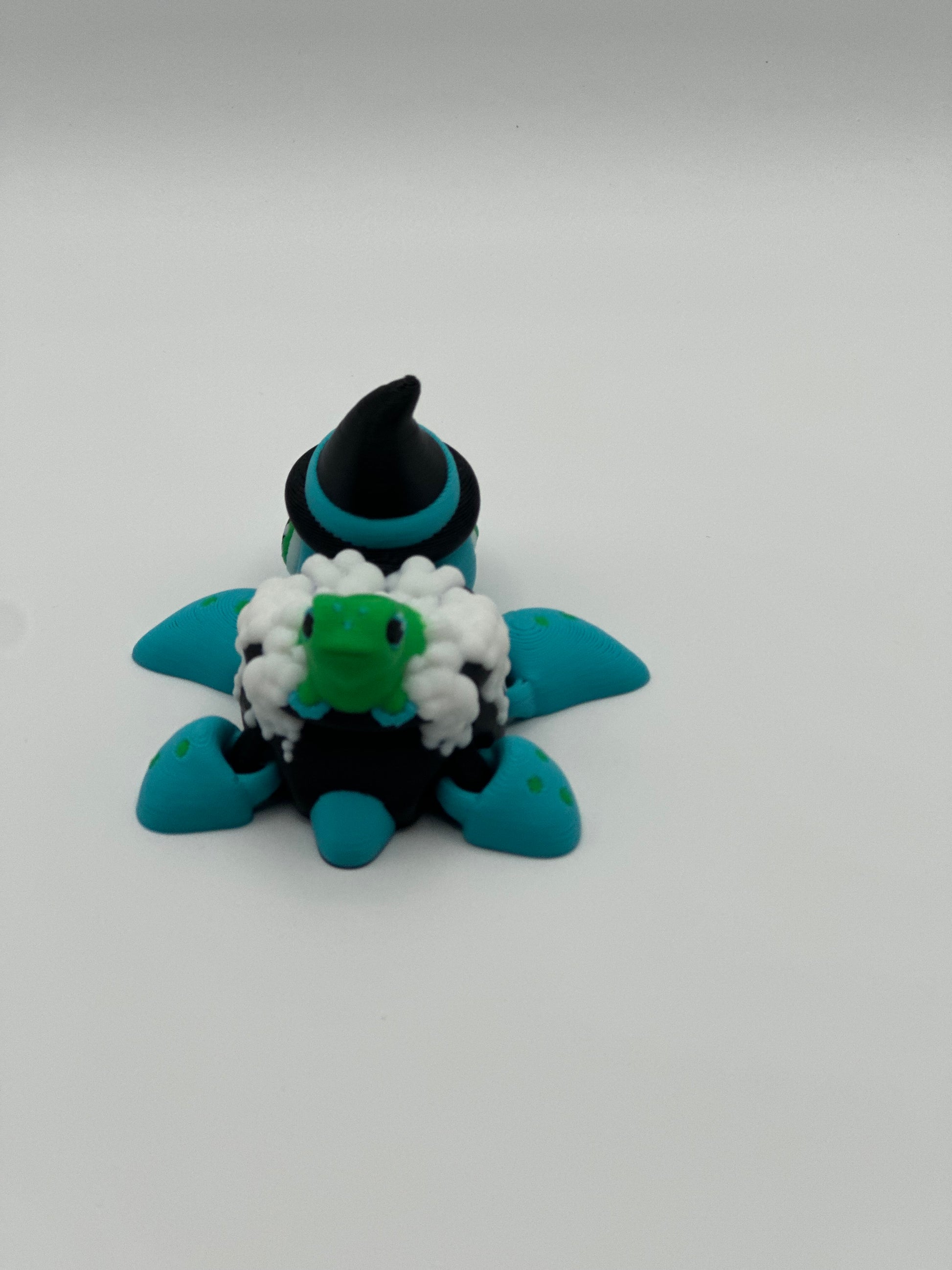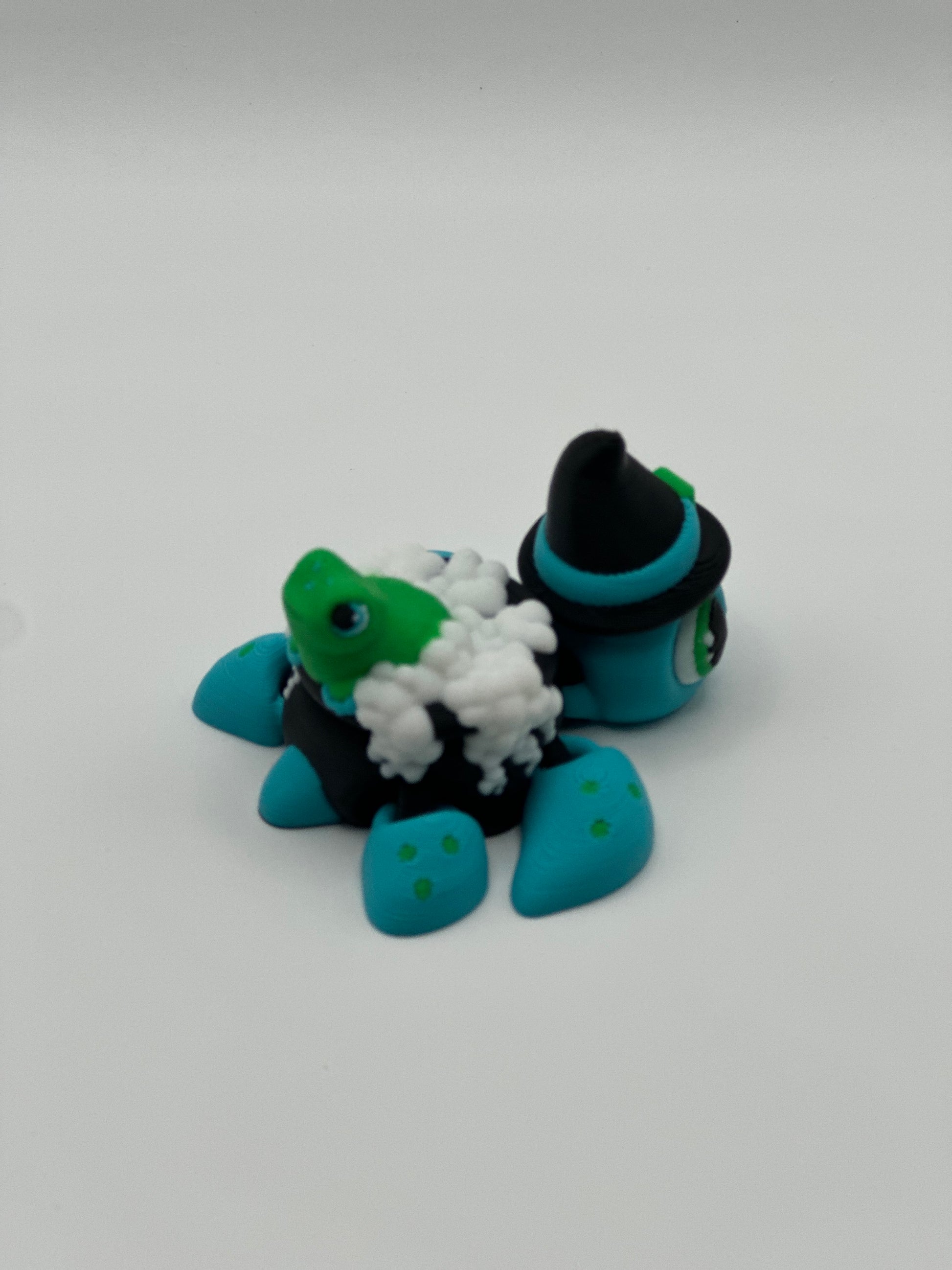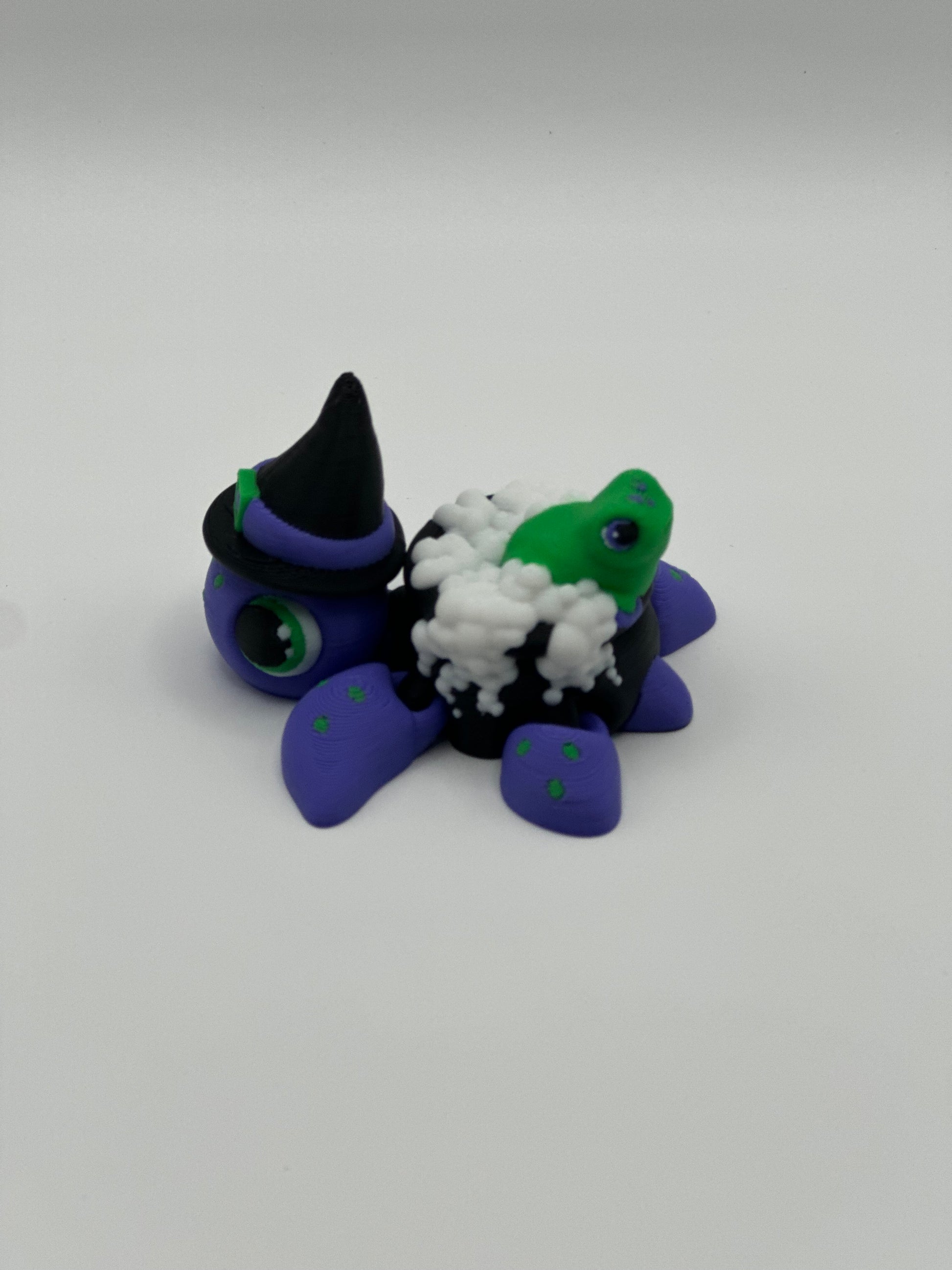 Get ready for some serious magic with Witch Turtle! This 3d printed turtle sports a witch hat and a cauldron shell with a frog in bubbling cauldron bubbles. With articulated fins and head, this 2.75"x2.5"x1.75" turtle is sure to make a quirky addition to your collection.