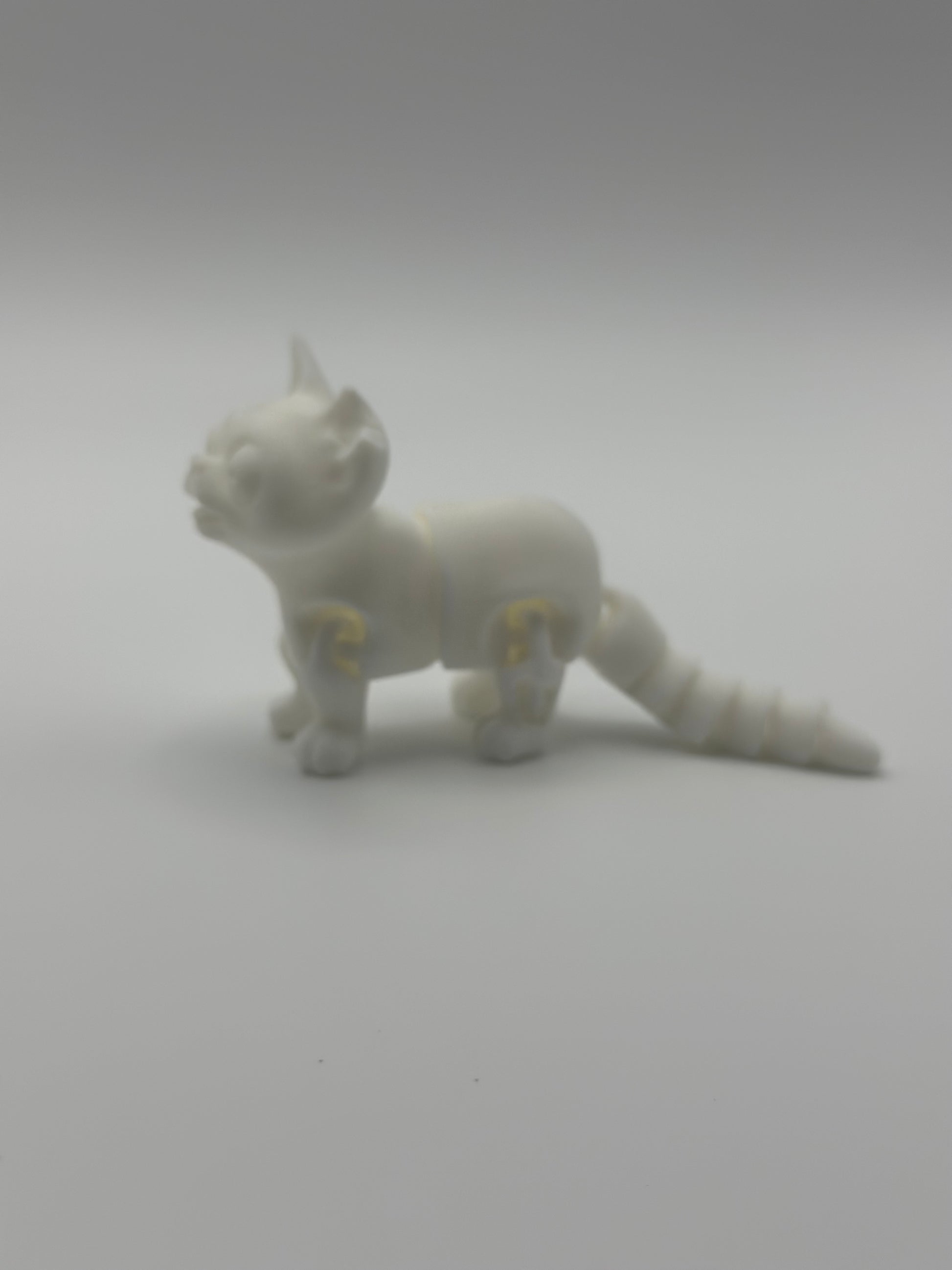 Introducing Zombie Kitty, the perfect combination of cute and creepy. This 3D printed kitty features an articulating design and a spooky zombie pattern. Measuring at approximately 3.5 inches by 1.5 inches by 1.5 inches, it's the perfect size for any collection. Embrace your love for all things undead with Zombie Kitty.